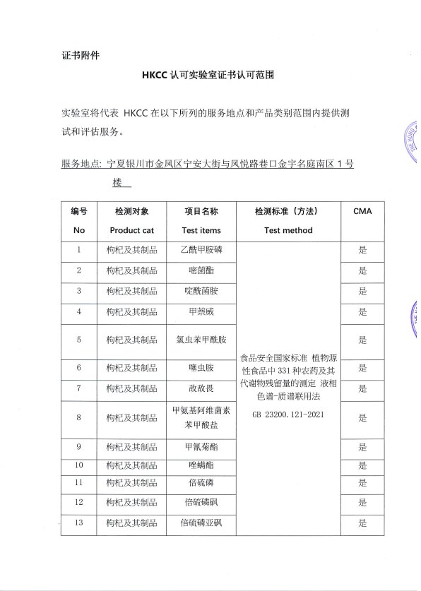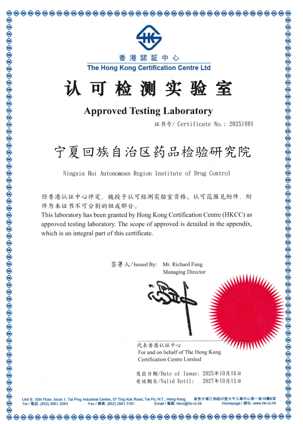 自2023年8月25日和香港STC签订“技术合作协议”以来,宁夏药品检验研究院不断强化国家枸杞产品质量检验检测中心(宁夏)能力建设水平,扩充枸杞产品检验检测能力的同时,积极推进与香港STC公司检测数据互相认证认可,通过开展线上技术交流会、技术审核等系列活动,从多方面考察双方实验室47个参数的检验检测能力,最终通过了第二批47个参数的认证认可,获得了香港认证中心的认可检测实验室证书和认可范围。